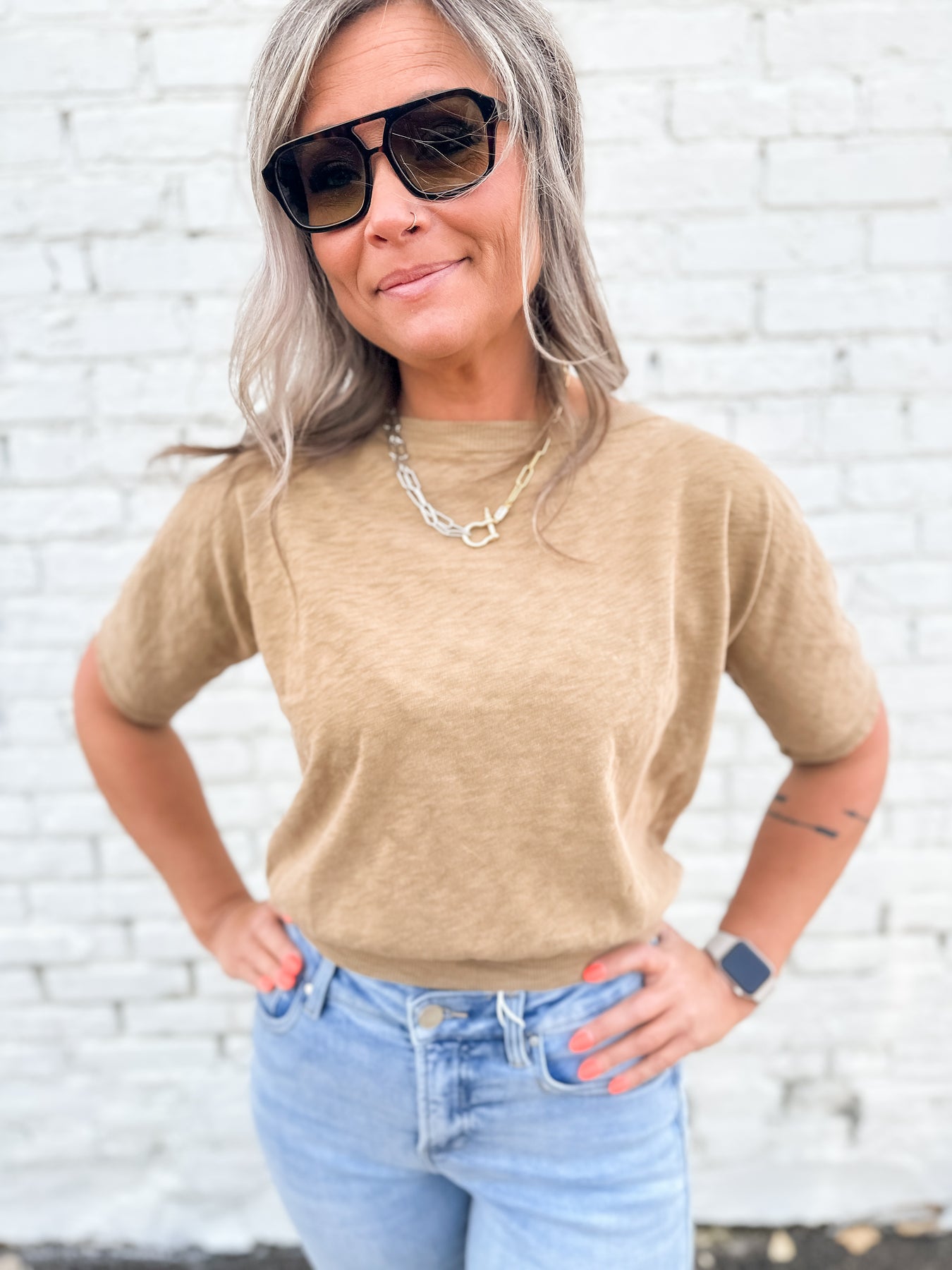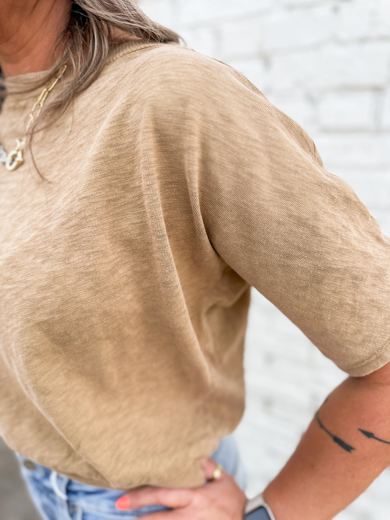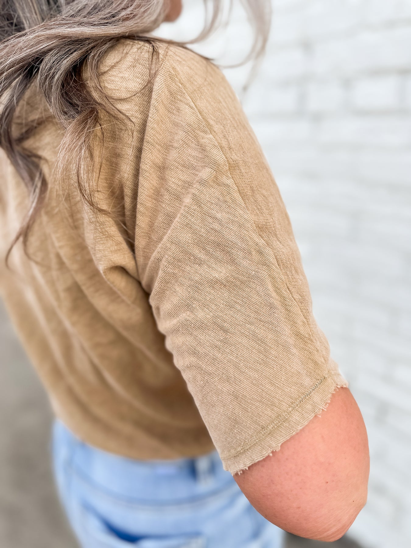 That elevated everyday top-the Sailor delivers. Elastic waist for easy styling and details including raw hem sleeves. Finished crew neckline. Beautiful gold color for mix and match styling all spring-fall long. Lightweight and breathable. Your elevated basic to a t. *Arona Not Pictured*