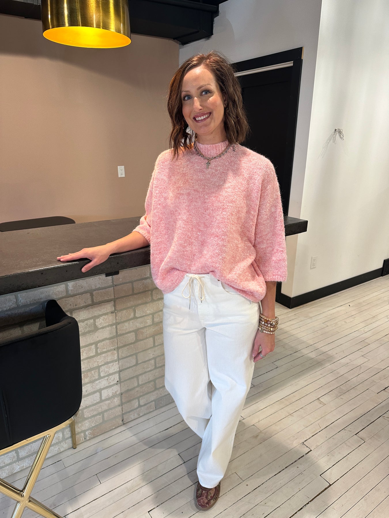 The Maren Drop Shoulder Sweater is your go-to piece for effortless comfort. This perfectly oversized short sleeve sweater in soft pink marled delivers a relaxed, laid-back vibe that pairs with everything in your closet. Lightweight and breathable, it's ideal for layering or wearing solo when you want that cozy-casual feel without the bulk. Perfect for transitional weather or year-round styling.