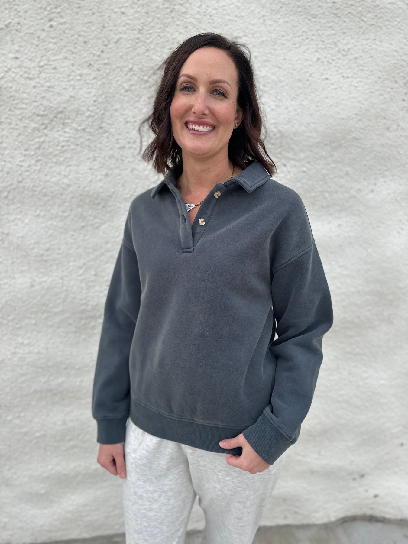 A cozy classic, this sweatshirt is featured in a soft garment dyed fabrication with a half button neckline and oversized fit.