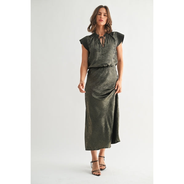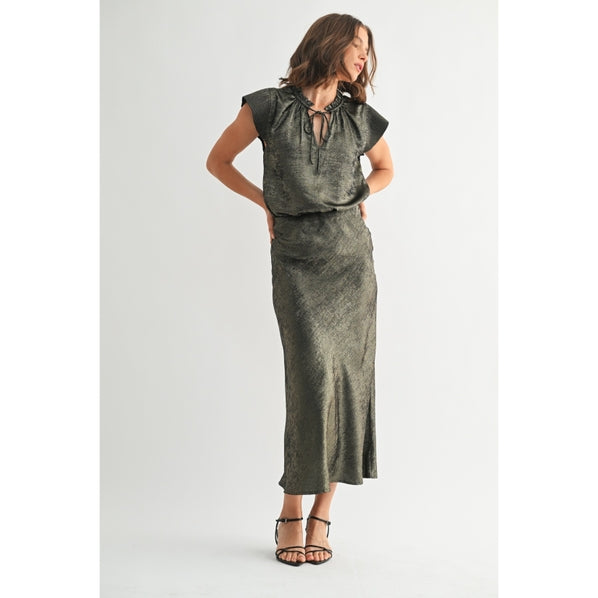 The Jasmine Metallic Maxi Skirt brings effortless glamour to your everyday rotation. This line skirt features a stunning metallic gold foil finish that catches the light beautifully, making it perfect for elevating casual outfits or dressing up for special occasions. The sleek silhouette flatters all body types while the shimmering detail adds just the right amount of sparkle without overwhelming your look. Pair it with basics for an instant style upgrade. Matching top available for a "dress" look.