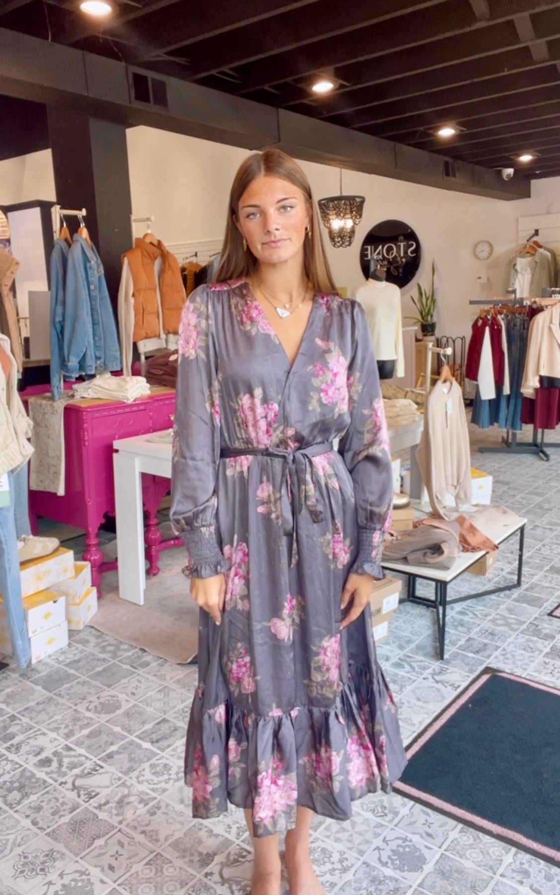 The Miah Floral Midi Dress features a smooth satin texture adorned with beautiful floral patterns, making it a stylish choice for any occasion. Its elegant design effortlessly blends fashion with comfort, creating a standout statement piece perfect for everyday wear or special events.