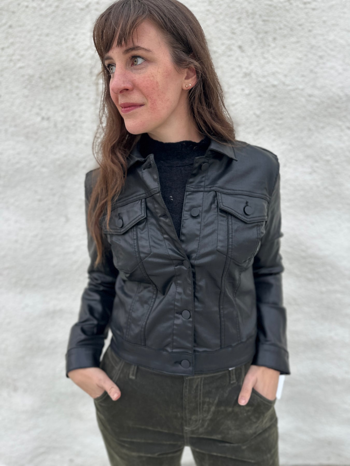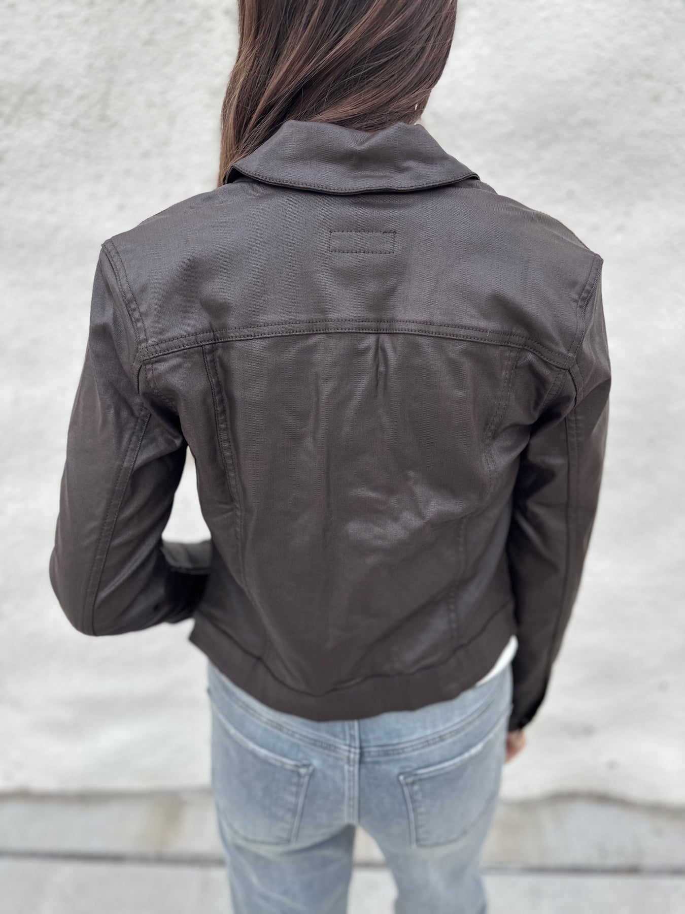 Coated for an elevated casual look, this slightly cropped trucker jacket is made from lightweight stretch denim in a coated fabric that is a staple.