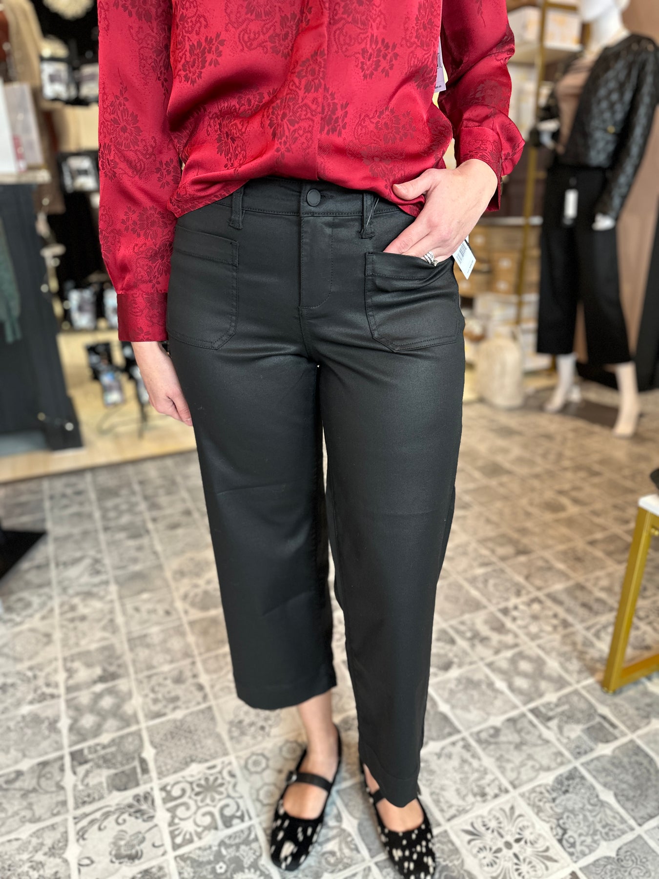 Effortless style meets everyday comfort in this cropped wide-leg silhouette. The sleek black coated denim delivers a polished, modern edge while the relaxed wide-leg cut flatters all body types. Functional front pockets keep your essentials close, and the 27" inseam hits at just the right length for a contemporary look. Perfect for dressing up or down, this versatile piece transitions seamlessly from day to night.