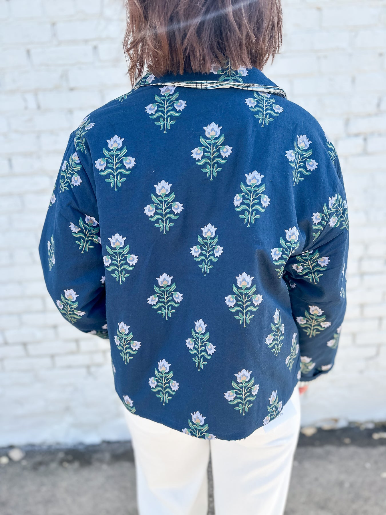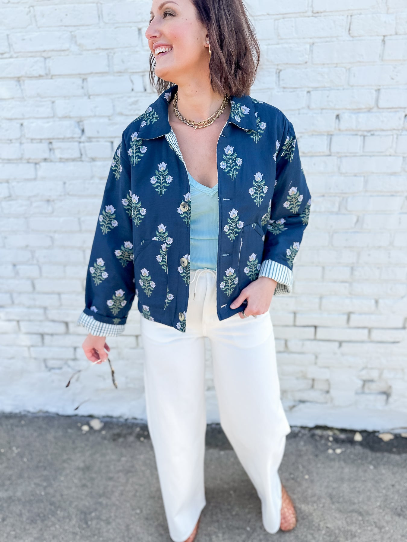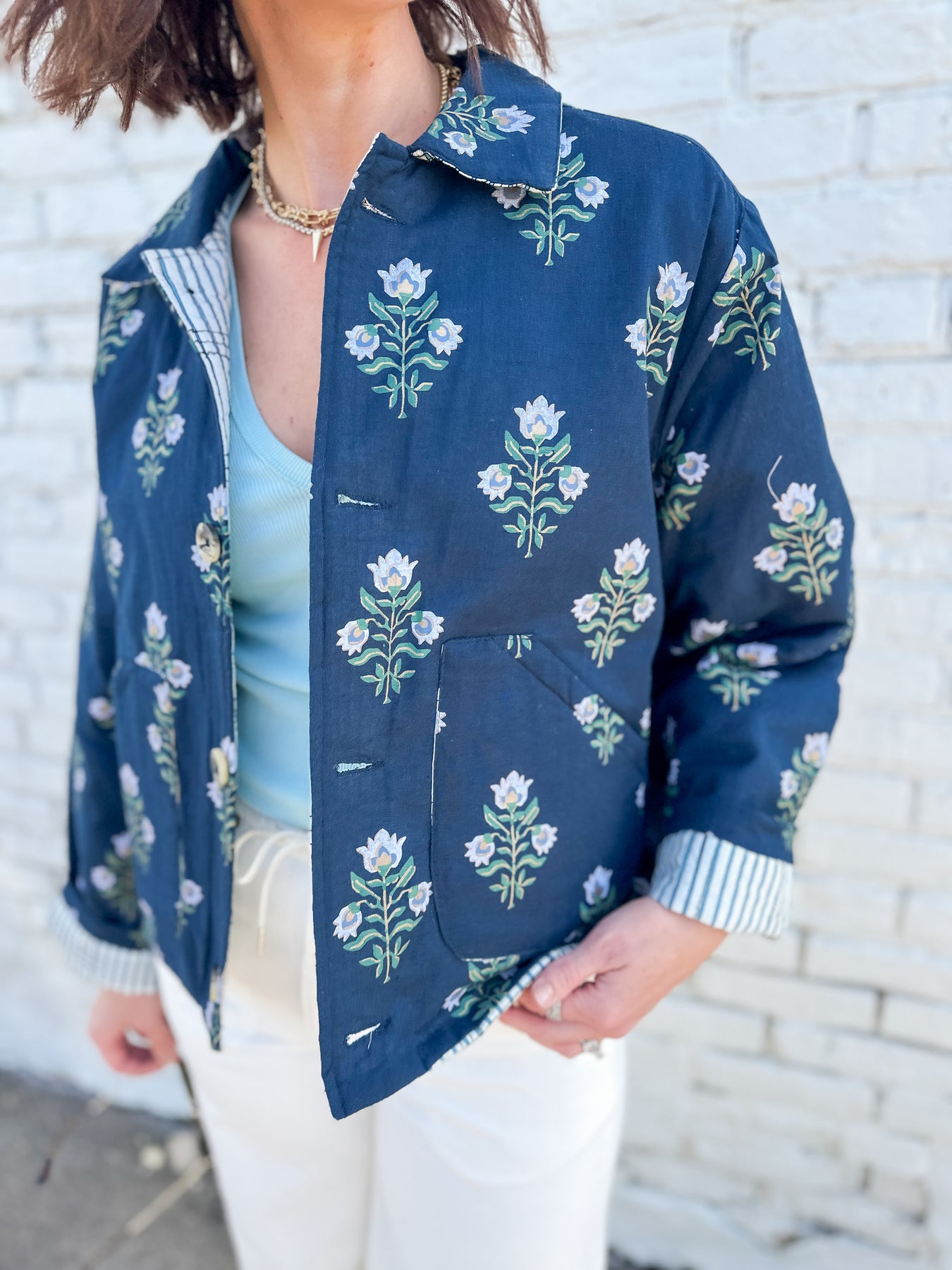 Reach for this darling floral cotton quilted jacket all spring long! Featuring a feminine floral pattern with subtle metallic gold ink on the outer and a fun pop of quilted stripe in the inside this jacket will show off your personality. Cuff the sleeves for a styled look that brings in the pattern play effortlessly. Lightweight yet warm, it's a must have for layering with elevated basics paired with denim or cream bottoms. Functional front buttons. Paired with the Neria tank in Cameo Green.