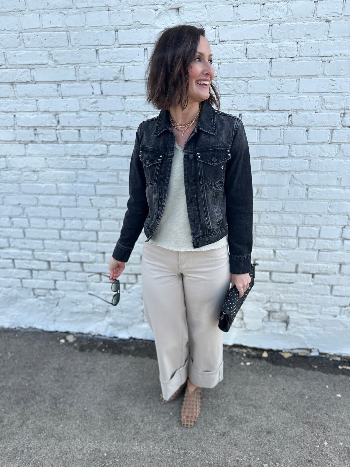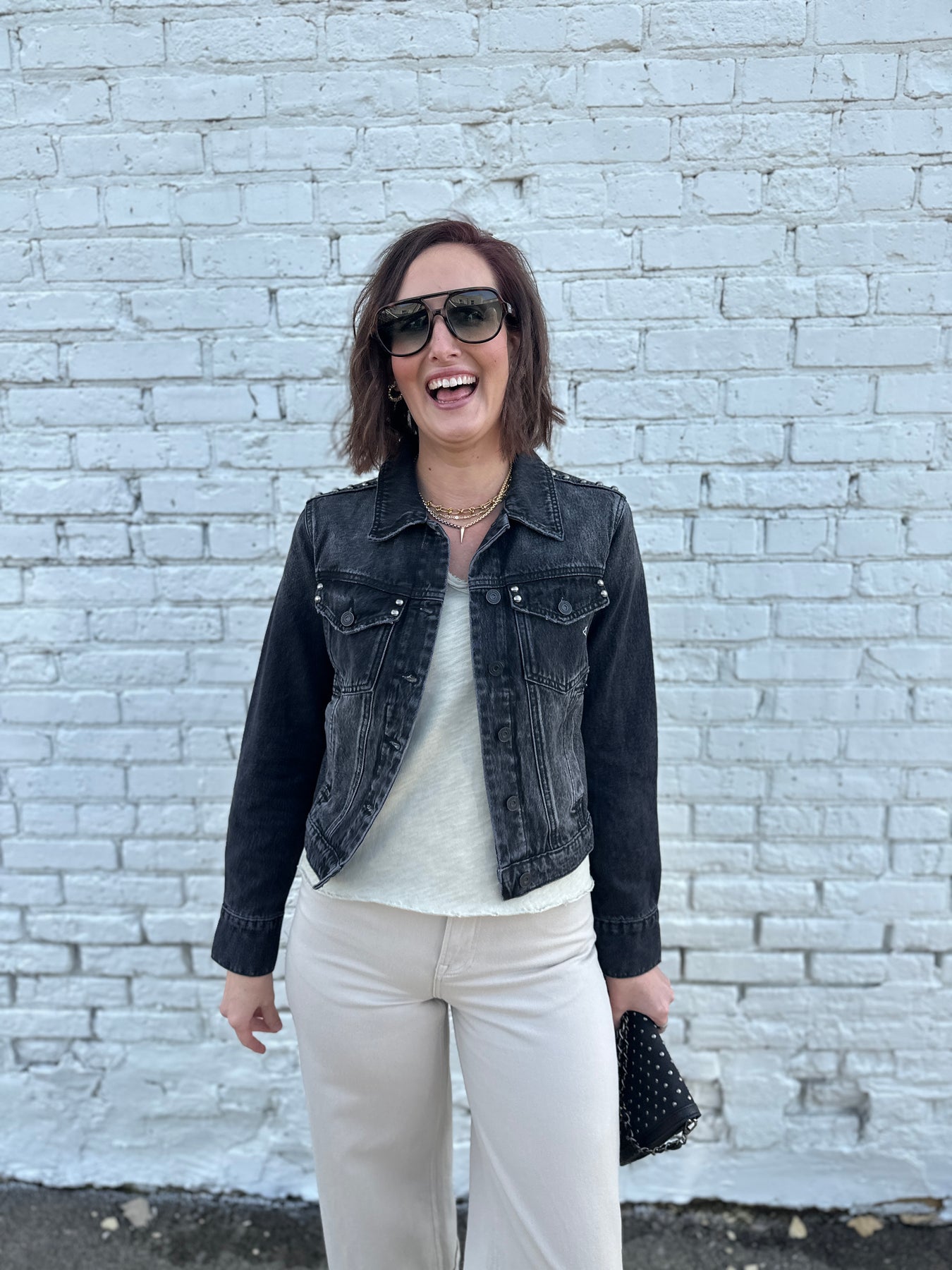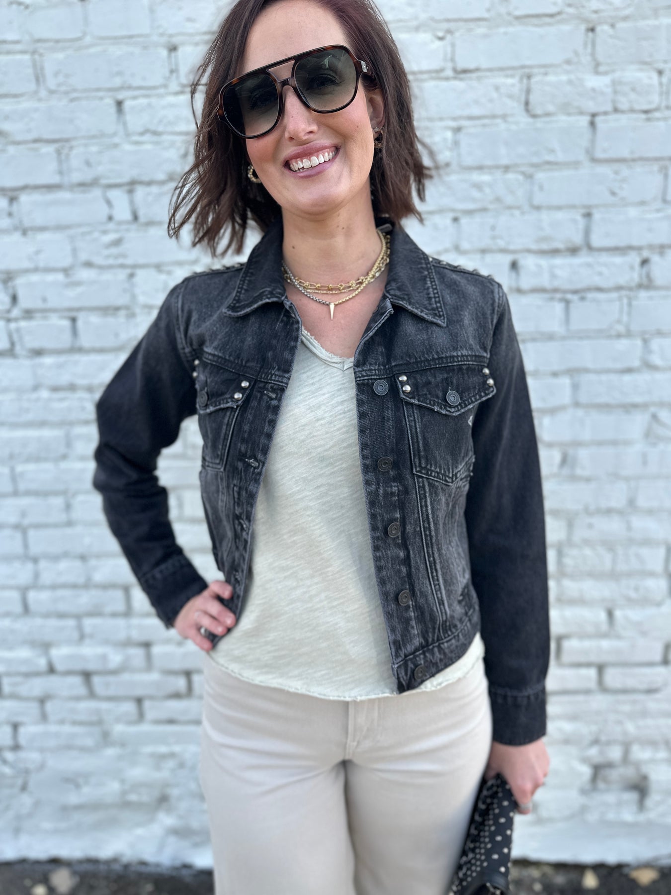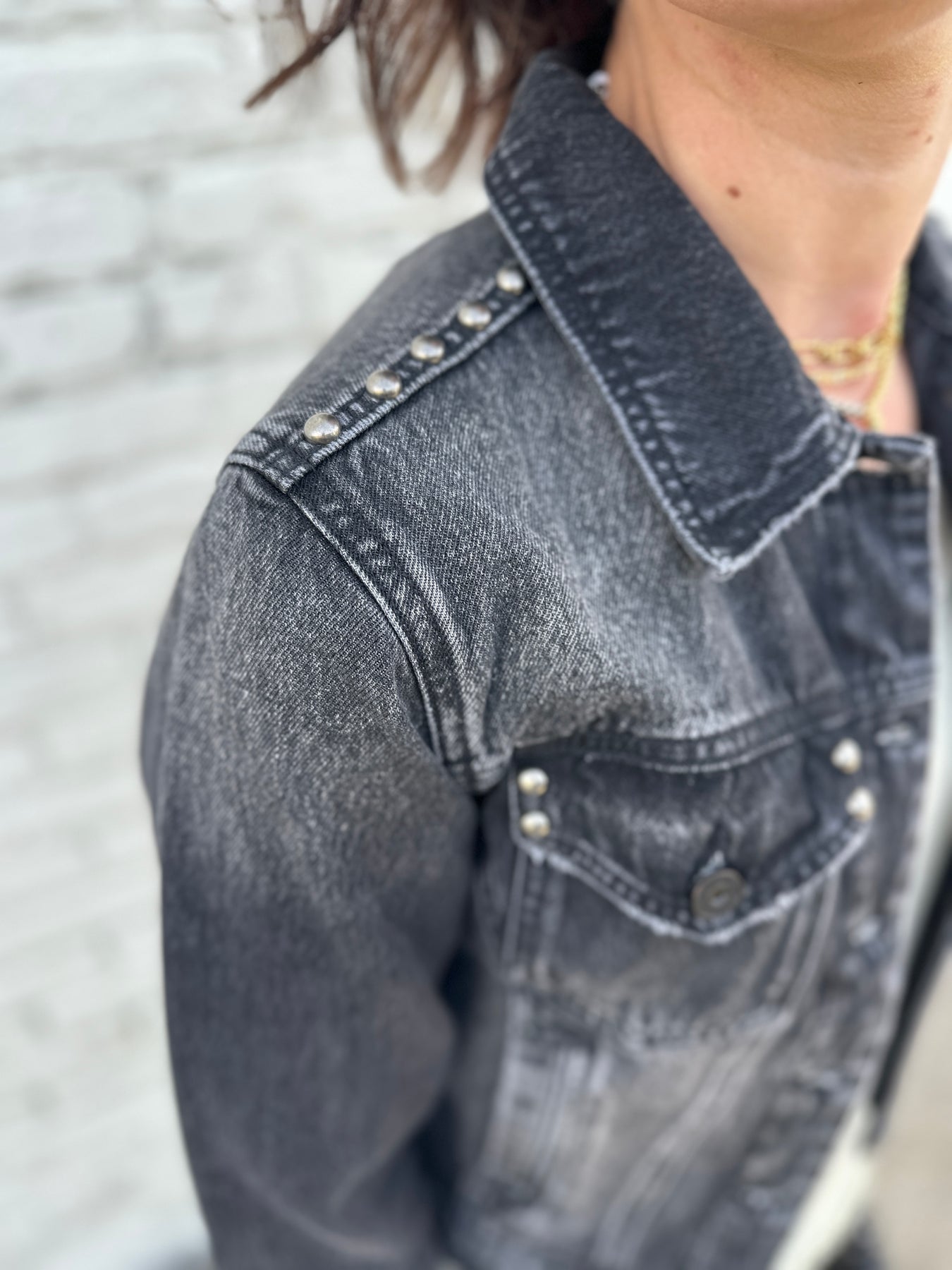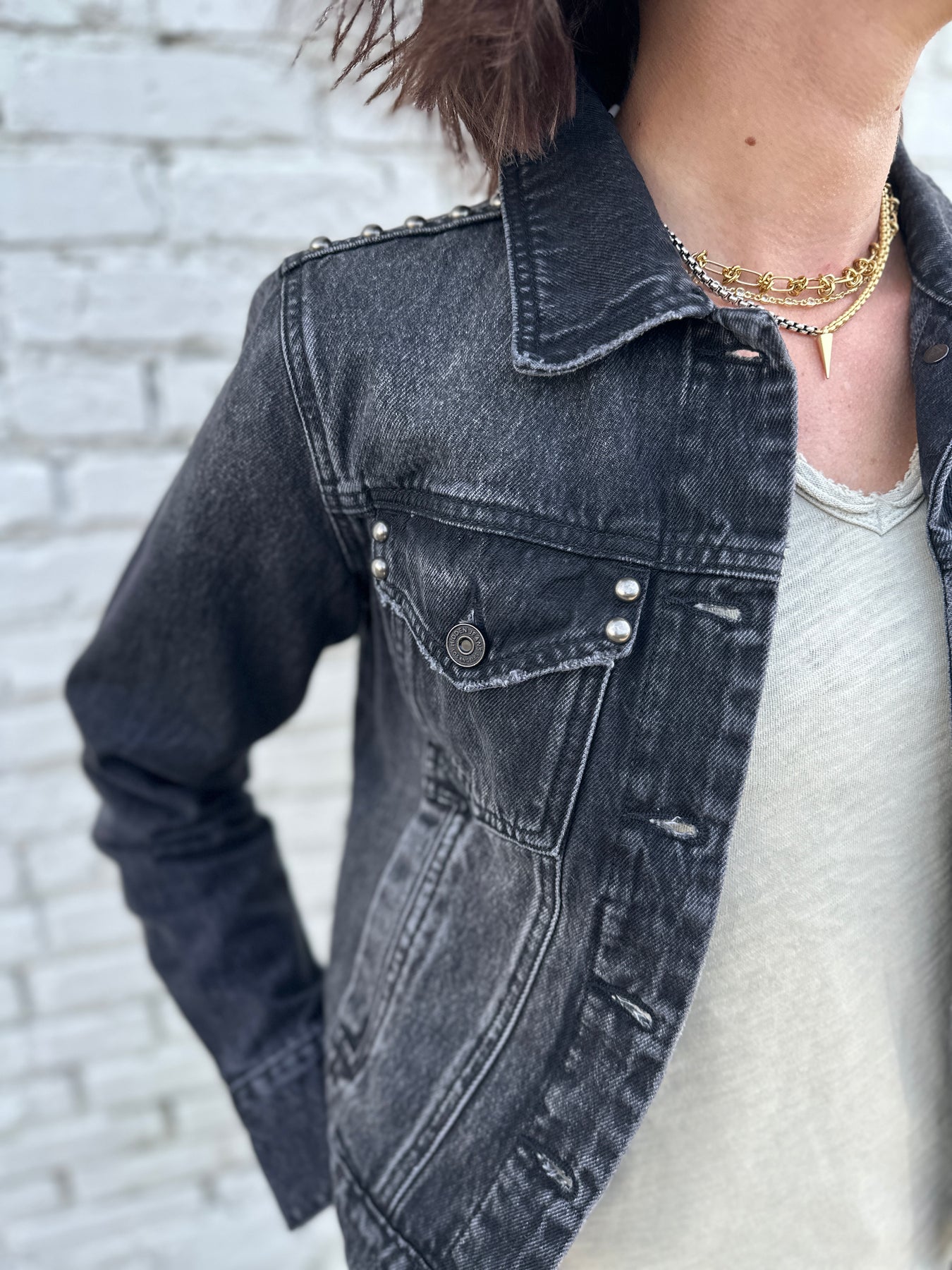 The Savannah brings together the perfect classic denim jacket in a washed black. Modern matte silver studded detail makes it current. Easy pair with track pants, denim, colored denim, and easy pants.