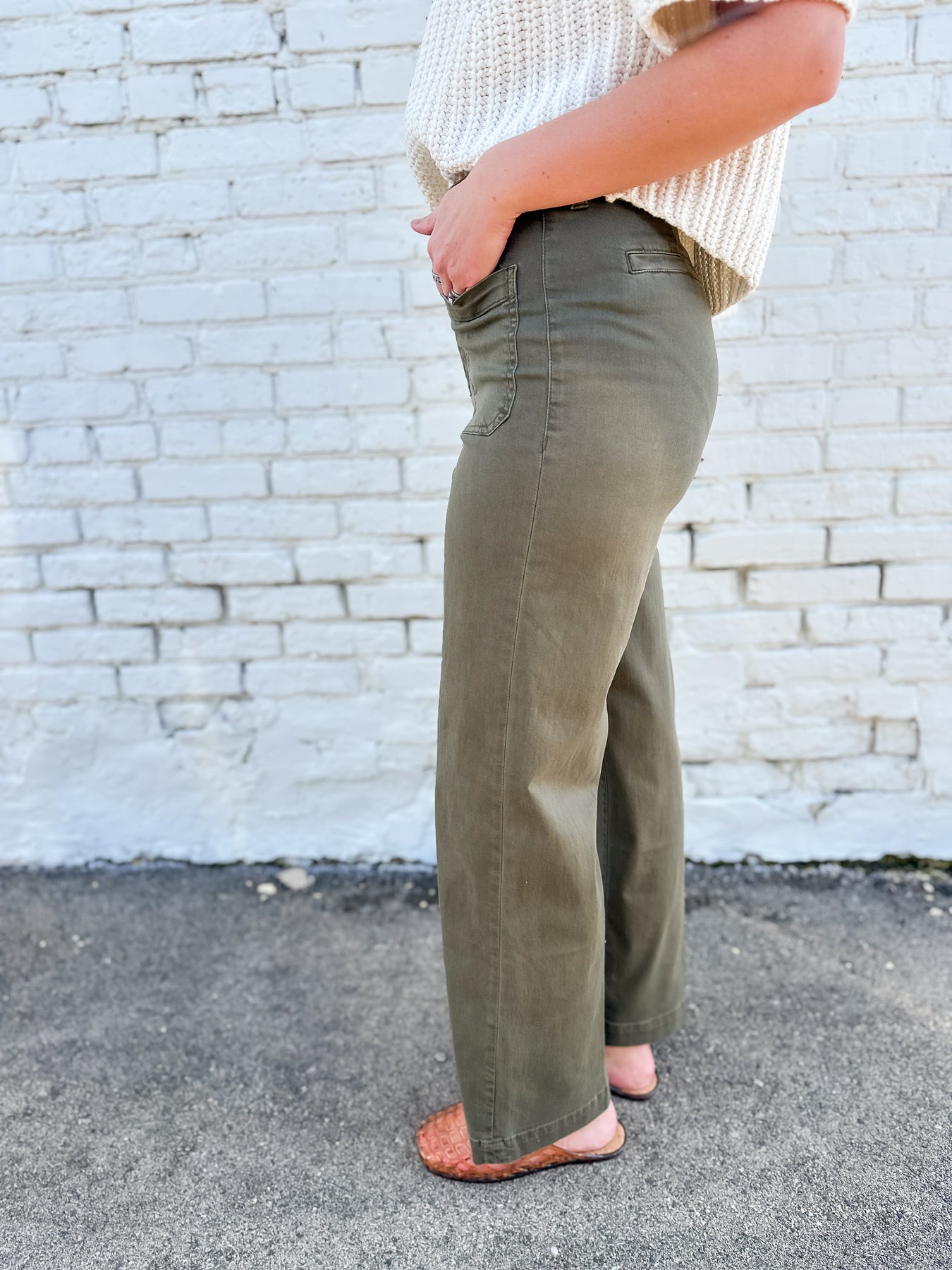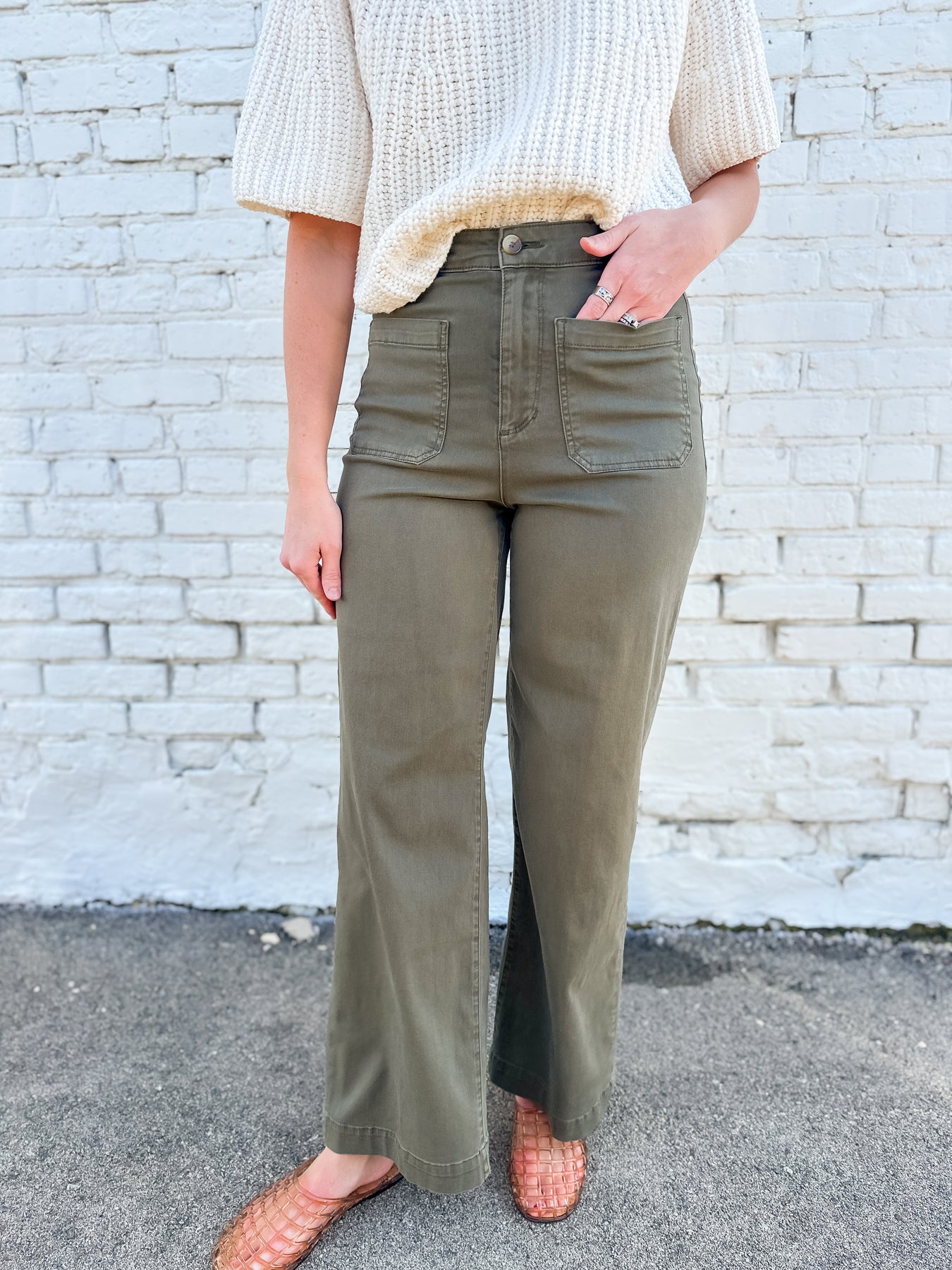 Classic trouser pant with some personality. These trousers feature front pockets for a clean hip fit and great stretch for an all day wear. Finished hem and back trouser pockets. Available in a timeless olive or a fun take in the trending railroad stripe in cream and black stripe! Pair with an easy summer top or lightweight jacket for a put together look.