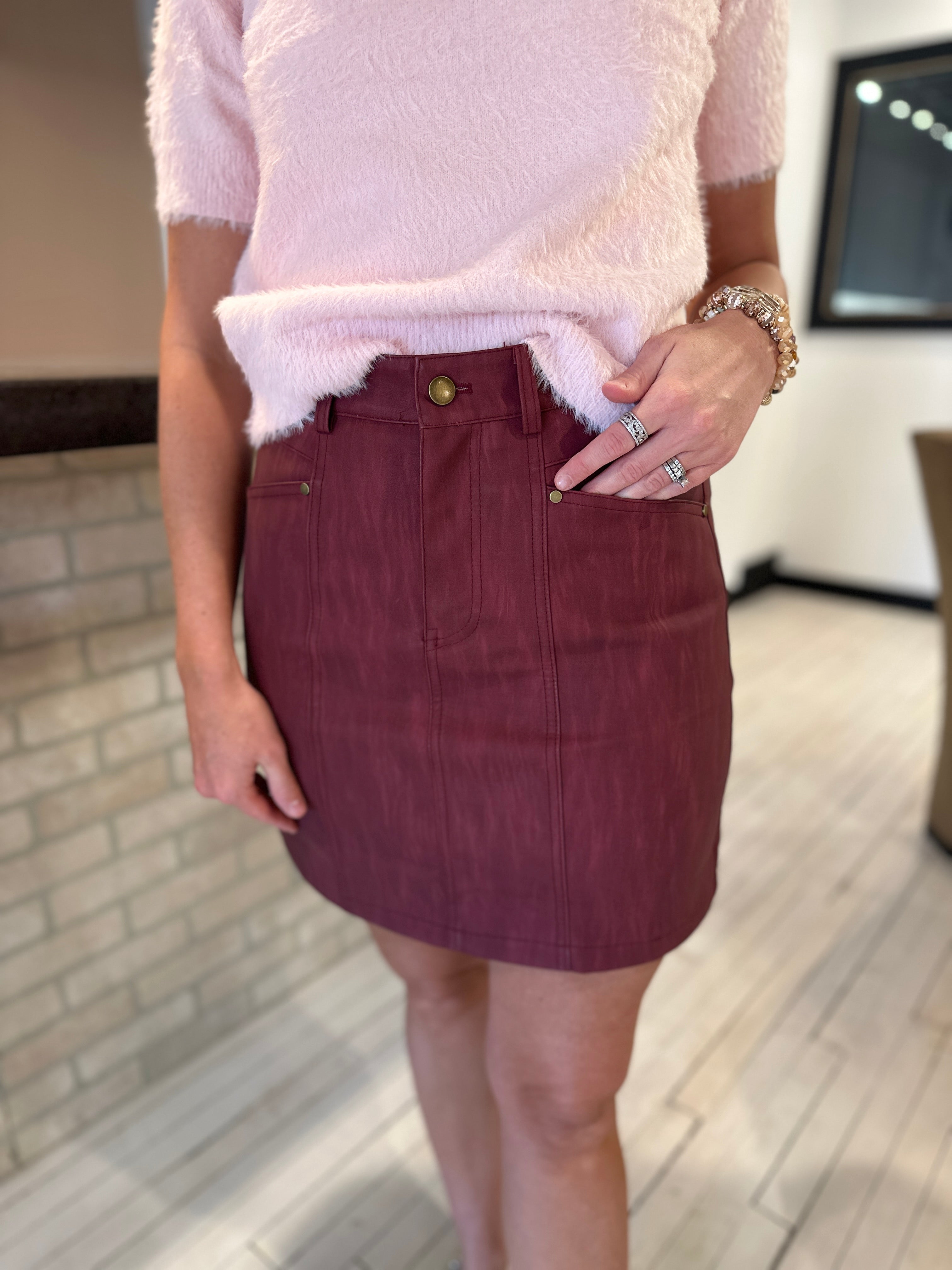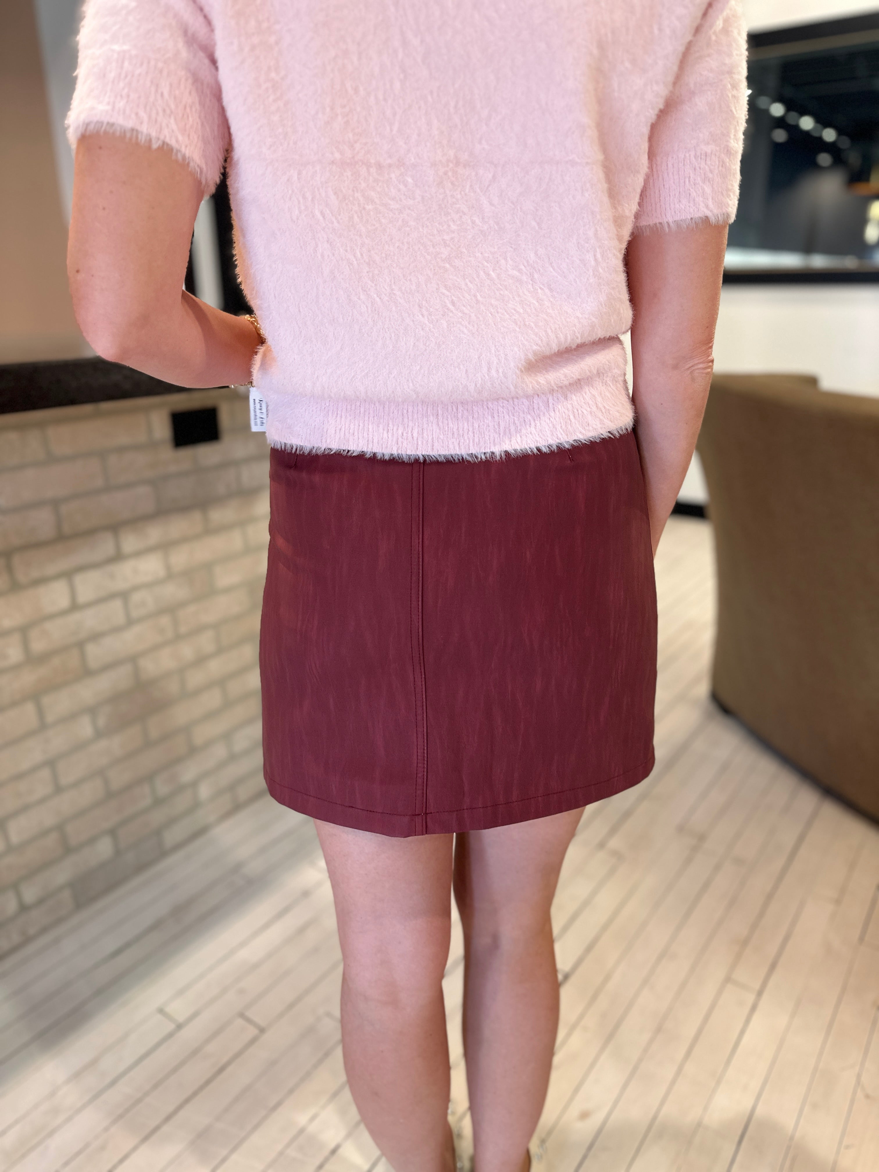 The Winslet Faux Leather Skirt brings effortless edge to your everyday rotation. This mini silhouette in sleek faux leather pairs beautifully with tights for a polished, modern look that works from day to night. The structured fabric holds its shape while remaining comfortable for all-day wear. A versatile piece that elevates basics and adds attitude to any outfit.