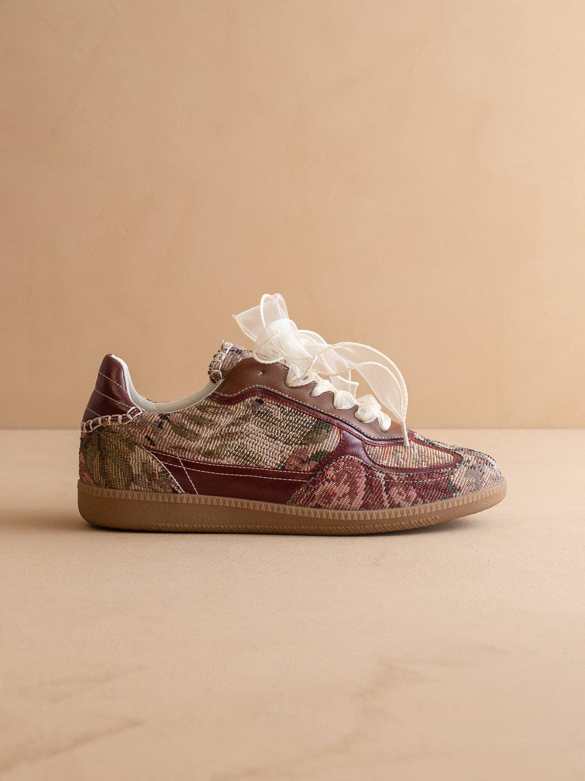 The Dalia Mauve Tapestry Lace Up Sneaker features a trendy floral tapestry design paired with delicate feminine laces, blending classic charm with modern style. Perfect for elevating casual looks with a subtle, stylish flair.
