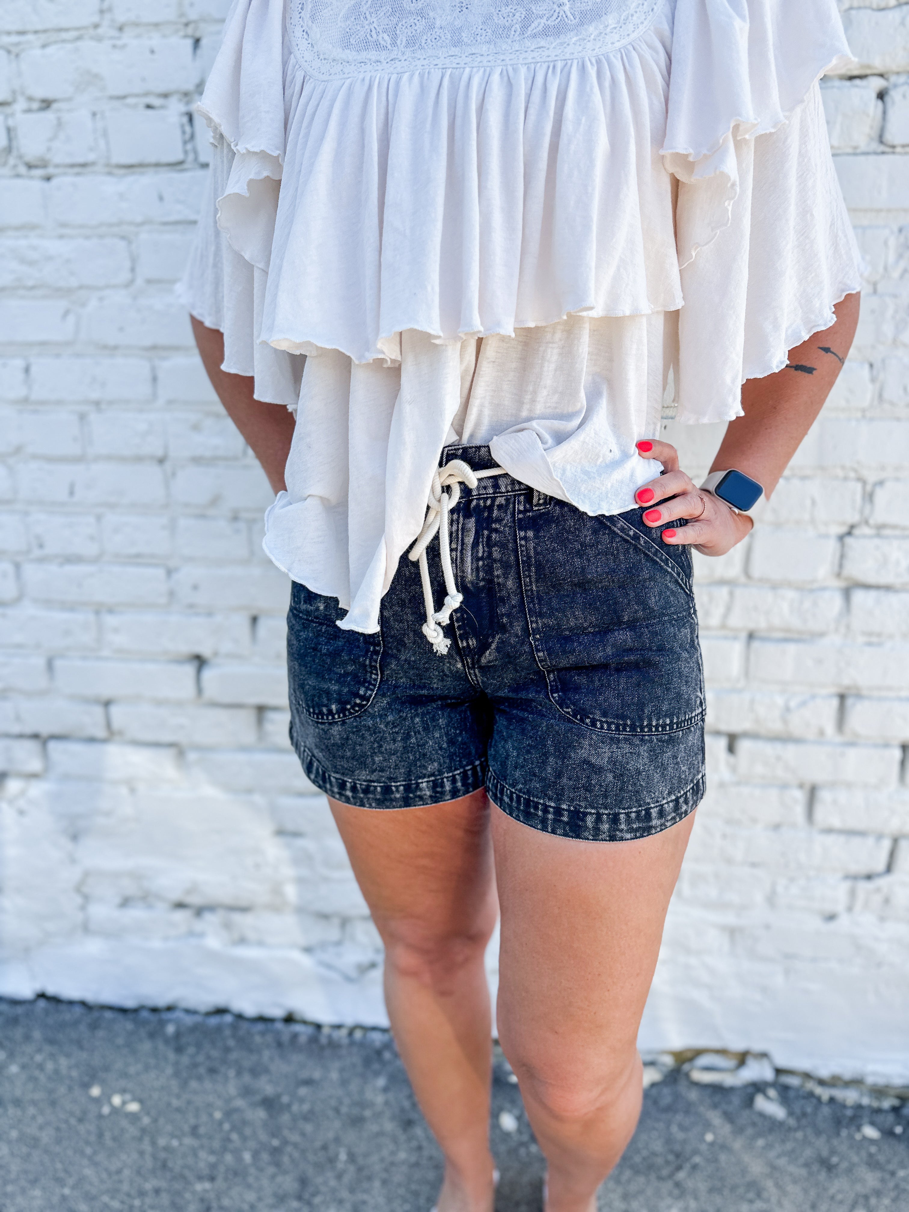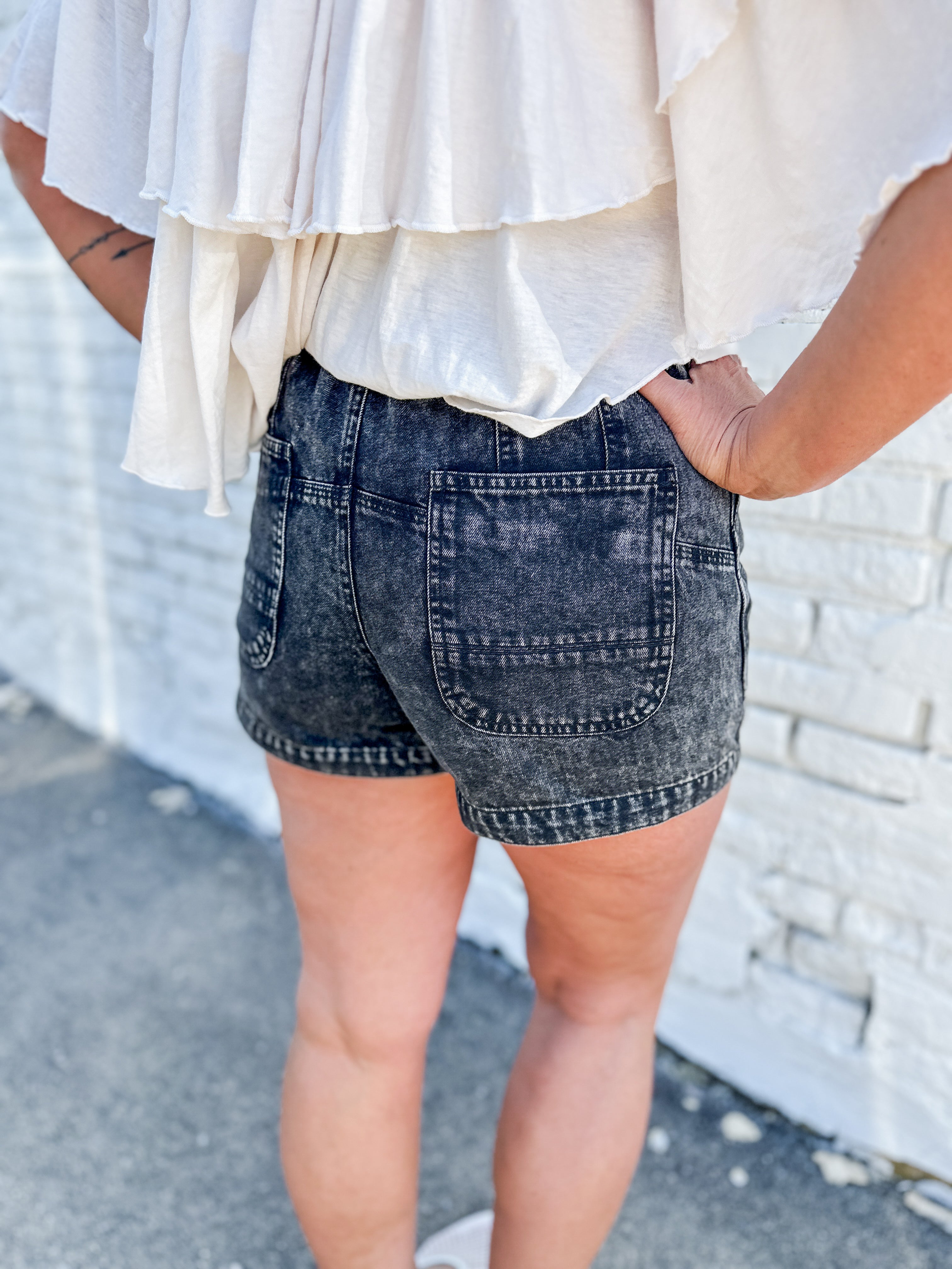 The Preston Tie Waist shorts are a cargo inspired style that feature an easy to wear washed black hue with a functional tie waist detail. Fun stitching throughout for a pop of fun. Zipper fly and button detail with back elastic waist.