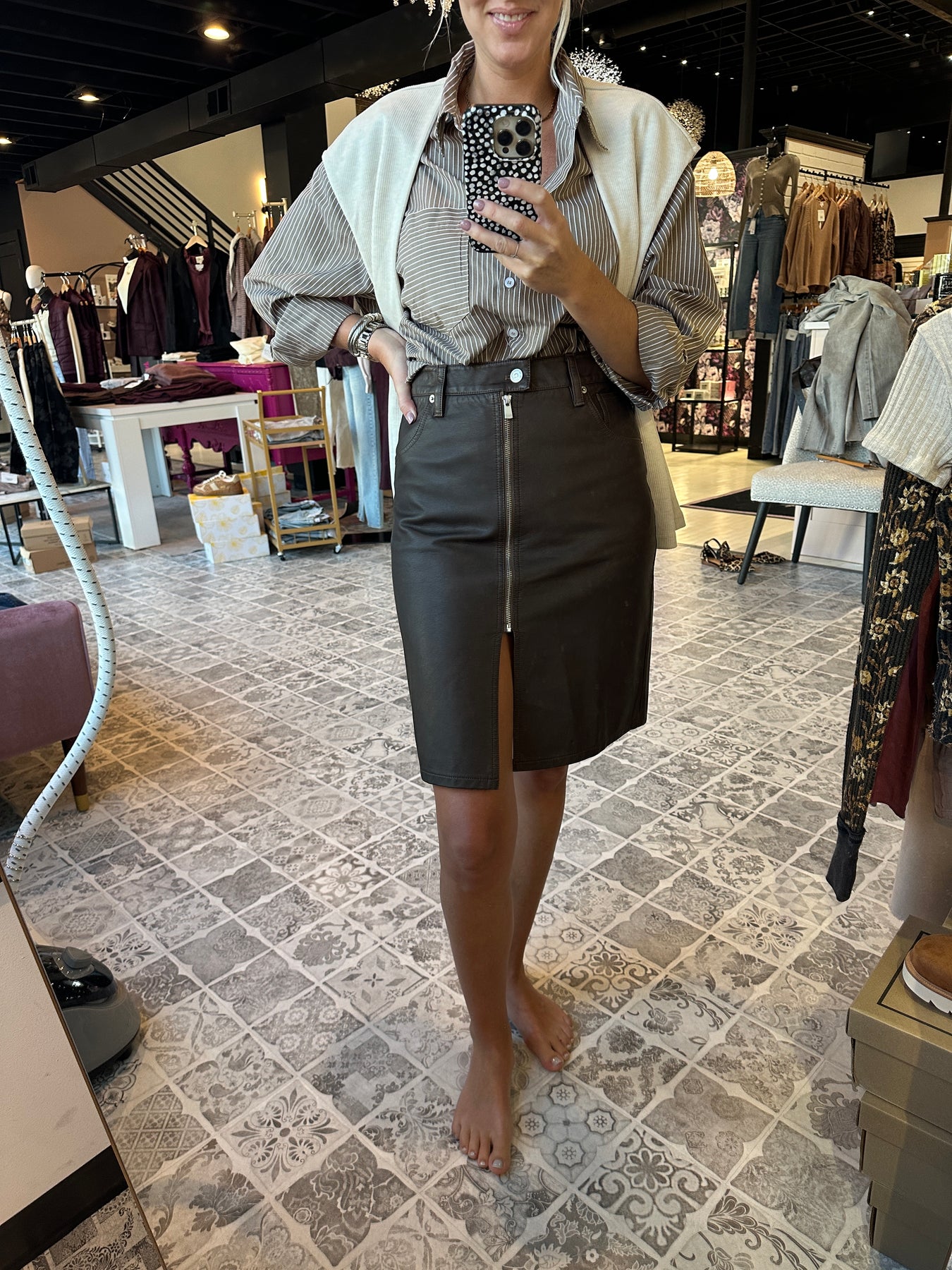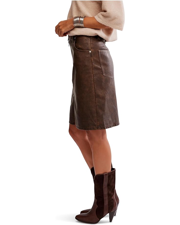 The FREE PEOPLE Sycamore Vegan Midi Skirt combines stylish brown vegan leather with thoughtful design elements. It includes a front zipper and button closure for easy wear and a flattering mid-rise fit. The midi length and subtle vented hem make it a versatile choice for everyday looks with a modern twist, offering a sleek silhouette with just the right amount of edge.
