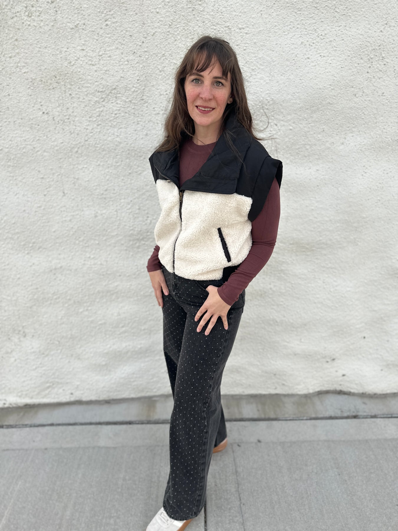 Meet the Rosalia Sherpa Vest—your new go-to layering piece that works year-round. This sleeveless wonder boasts a generous oversized cut, dramatic wide collar, and thoughtfully pieced construction that sets it apart. The plush sherpa fabric brings both warmth and sophistication, while the front zip lets you customize your coverage on the fly. Whether you're dressing down with jeans or elevating a casual look, this versatile vest pairs seamlessly with everything in your wardrobe while keeping you cozy and put-together.