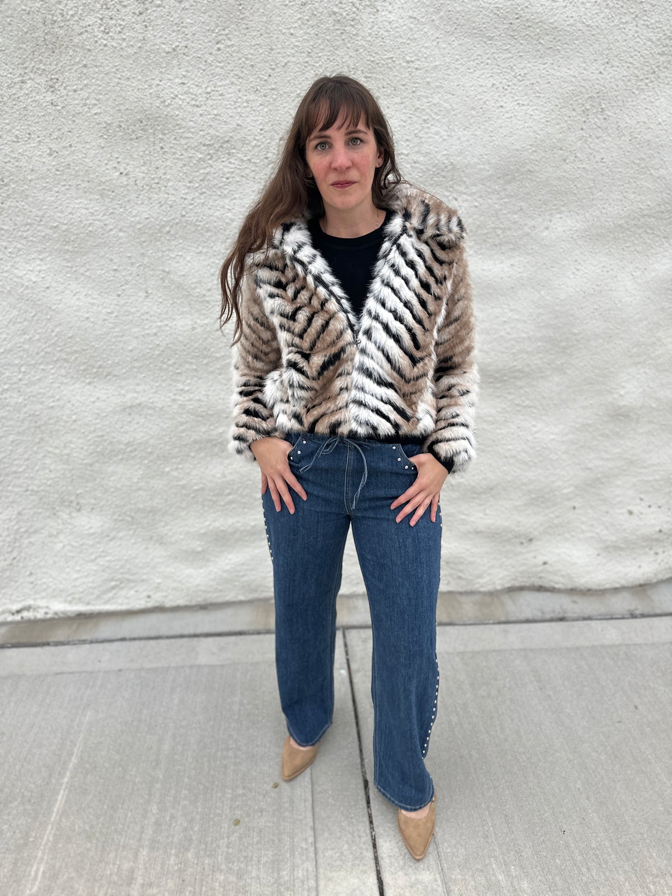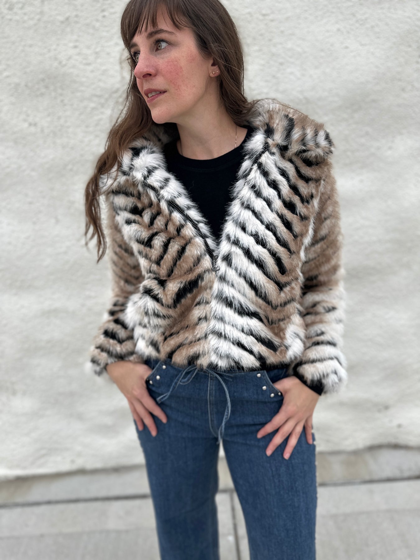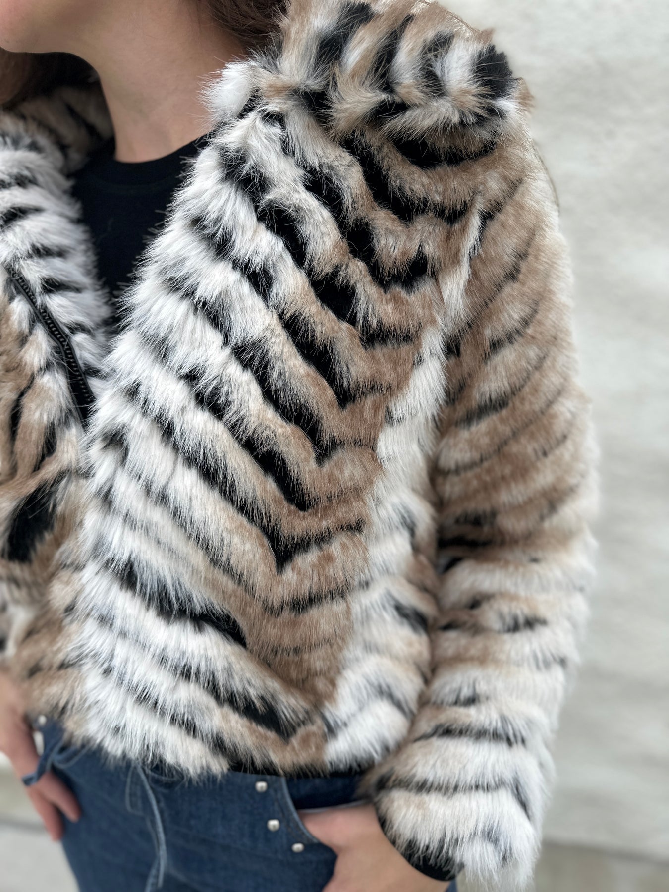Make a bold statement with The Braxton Jacket, featuring luxurious faux fur in striking tiger print. The convenient zip-up front and sleek faux leather zipper trim add modern edge to this versatile piece. Perfect for layering over your favorite outfits, this jacket combines comfort with undeniable style. Whether you're heading out for the day or making an entrance, The Braxton delivers that effortless cool factor every wardrobe needs.